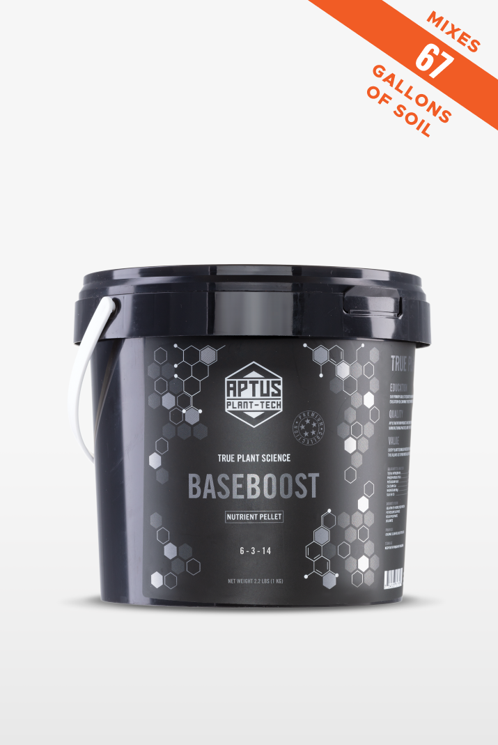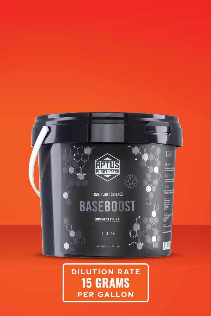 BASEBOOST is effective as a complete fertilizer for the grower with little time or trying to simplify the work of growing. For advanced growers looking to maximize yields, BASEBOOST is an effective replacement for a typical base NPK nutrient in combination with the rest of the APTUS boosters.